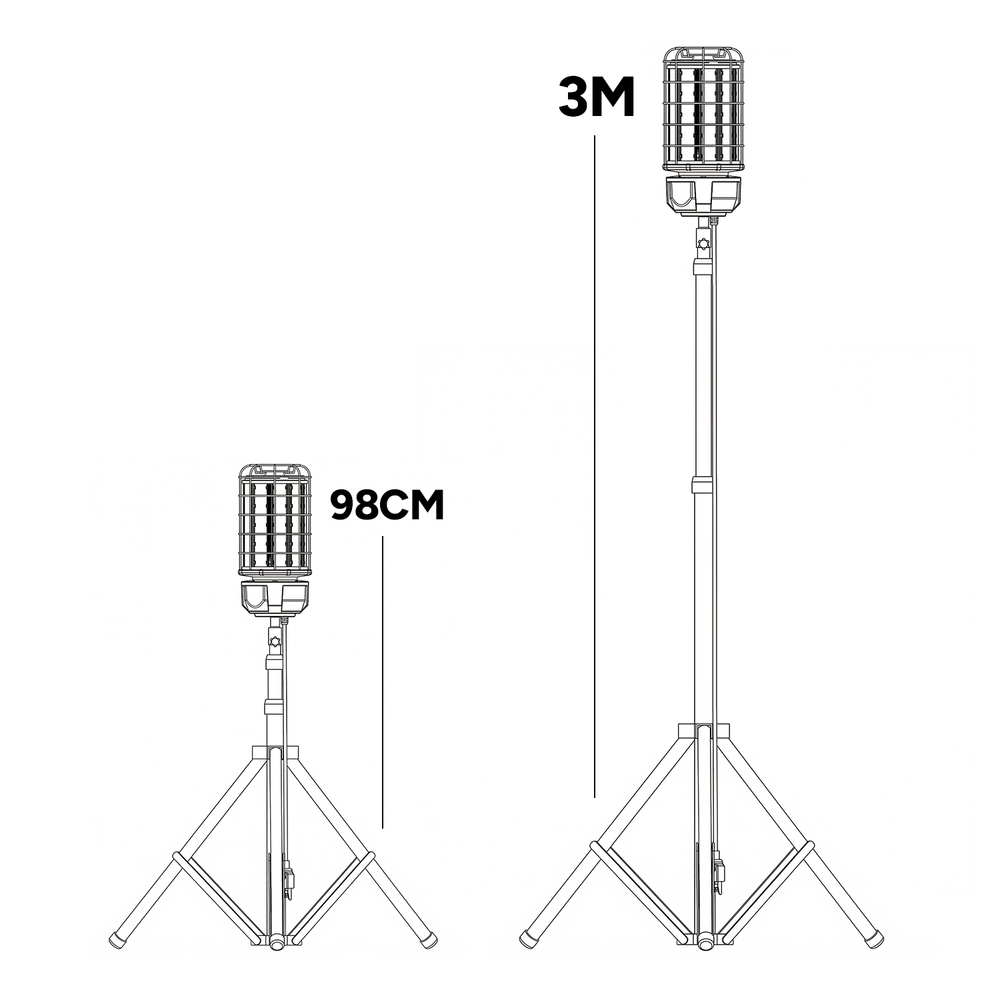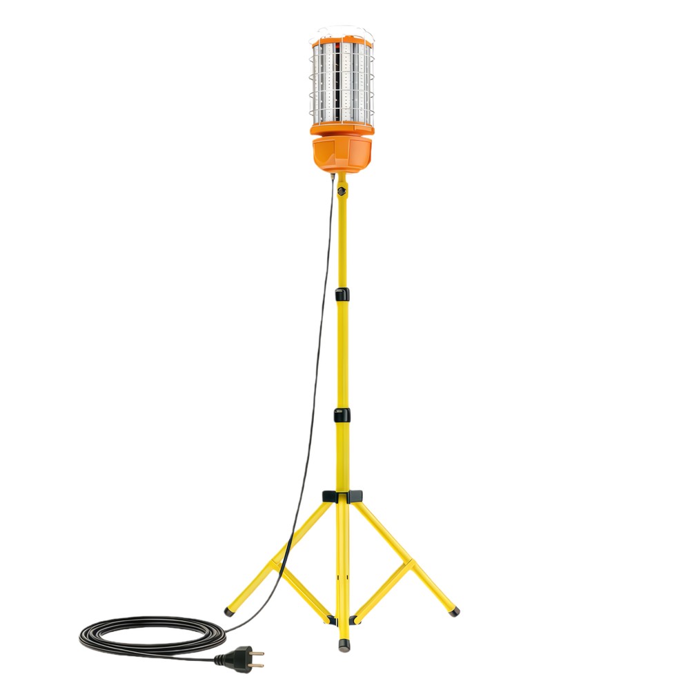 Lampen leveres komplet med en justerbar stander, der giver en samlet højde på 3,4 meter, hvilket sikrer fleksibel placering af lyskilden. Den 5 meter lange ledning med schuko stik giver god rækkevidde til strømkilder. Med en effekt på 150W og en spænding på 230V er det en energieffektiv løsning til professionel brug.