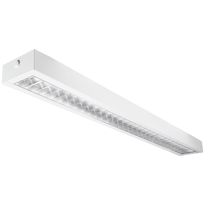 EcoLine Office 1200 er udstyret med en dobbelt parabolsk reflektor og diffuser, der sikrer en jævn og blændfri lysfordeling. For dem, der ønsker yderligere kontrol over lysstyrken, er der mulighed for at tilkøbe en dæmpbar løsning (DALI/SwitchDim).