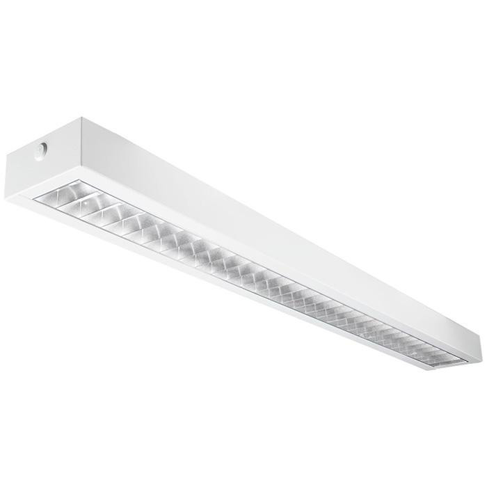 Nedhængt/påbygget armatur med 4000 Kelvin LED. Fladt design, pulverlakeret hvidt RAL9010 glans 25. Dobbelt parabolsk reflektor og diffuser med mulighed for dæmpbar løsning.
