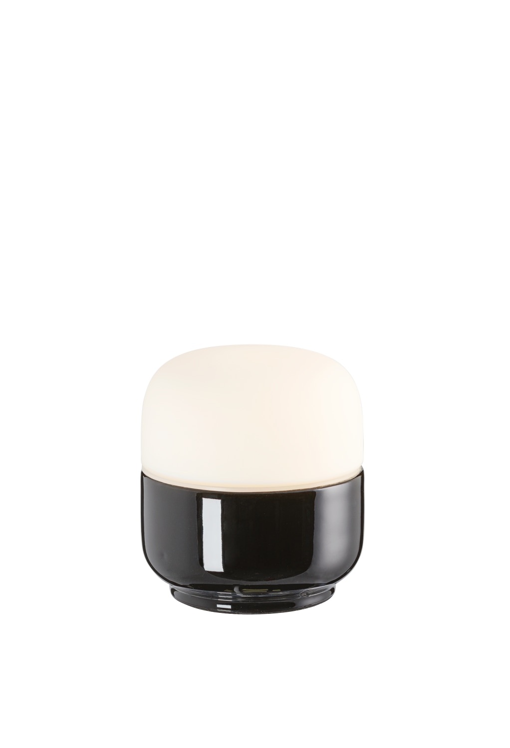 Elegant cylindrisk loft- og væglampe til både indendørs og udendørs brug. Lampen er sort og har en mat opal-kupa.