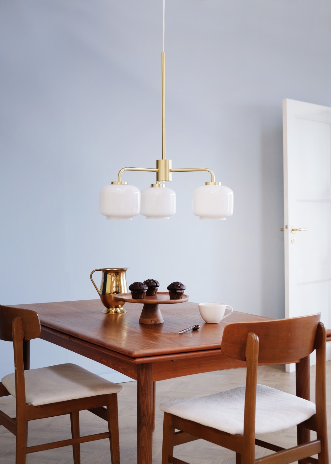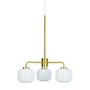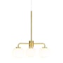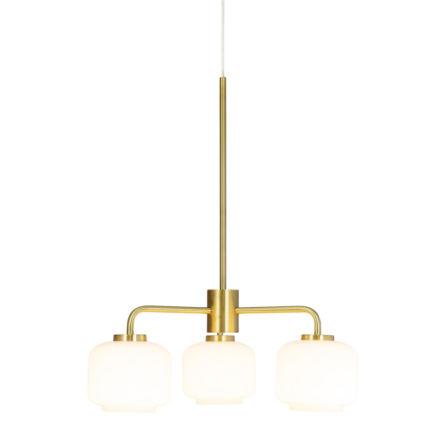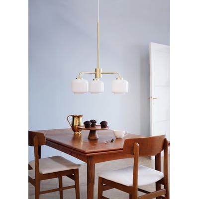 Klassisk og moderne lysekrone med 3 opal glas og mat messing ophæng, der giver et flot look. Perfekt til indendørs brug.