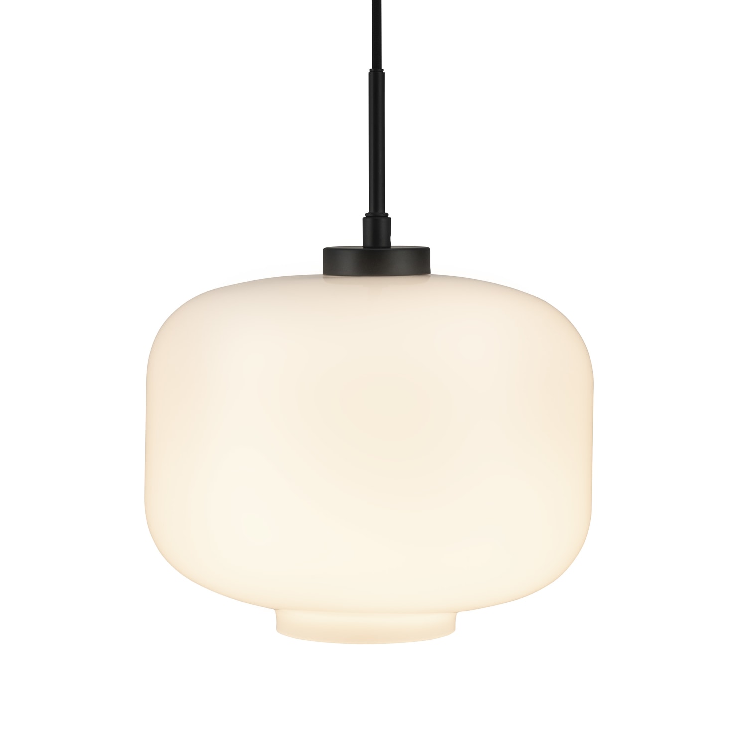 Klassisk ARP pendel med opal hvid glas og et ophæng i mat sort metal. Nem at montere og justere. Ledningen er i hvid stof.