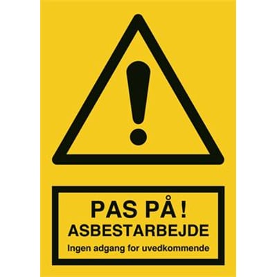 Advarselsskilt i A4-størrelse med teksten "Pas på asbestarbejde, ingen adgang for uvedkommende". Ideelt til sikring af arbejdsområder.