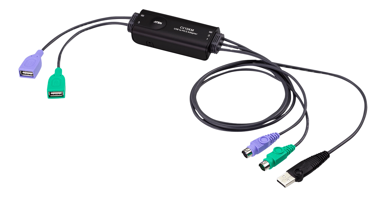 Denne konverter fra Aten gør det muligt at tilslutte et USB-tastatur og en USB-mus til en PS/2-port. Konverteren har en kabellængde på 80 cm.