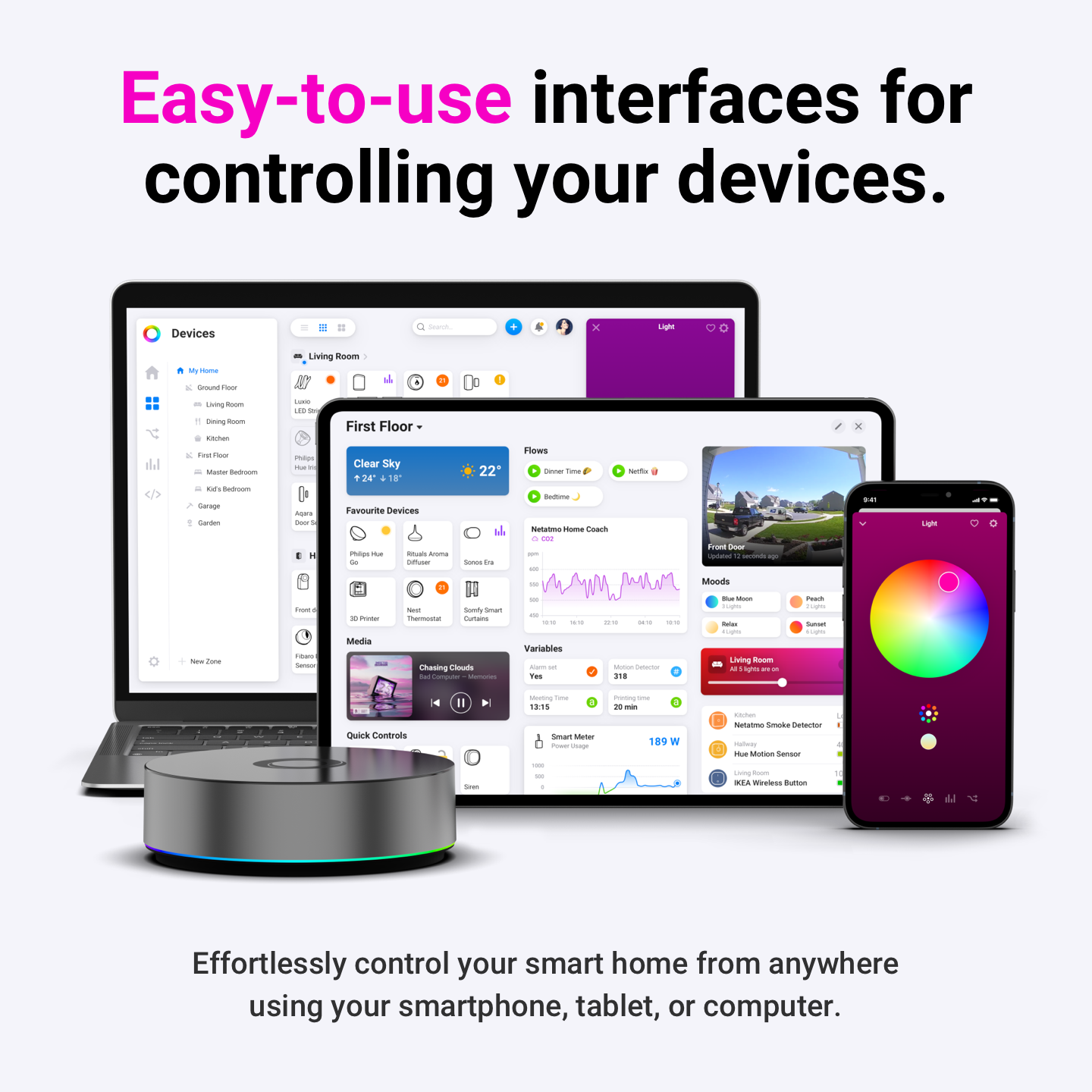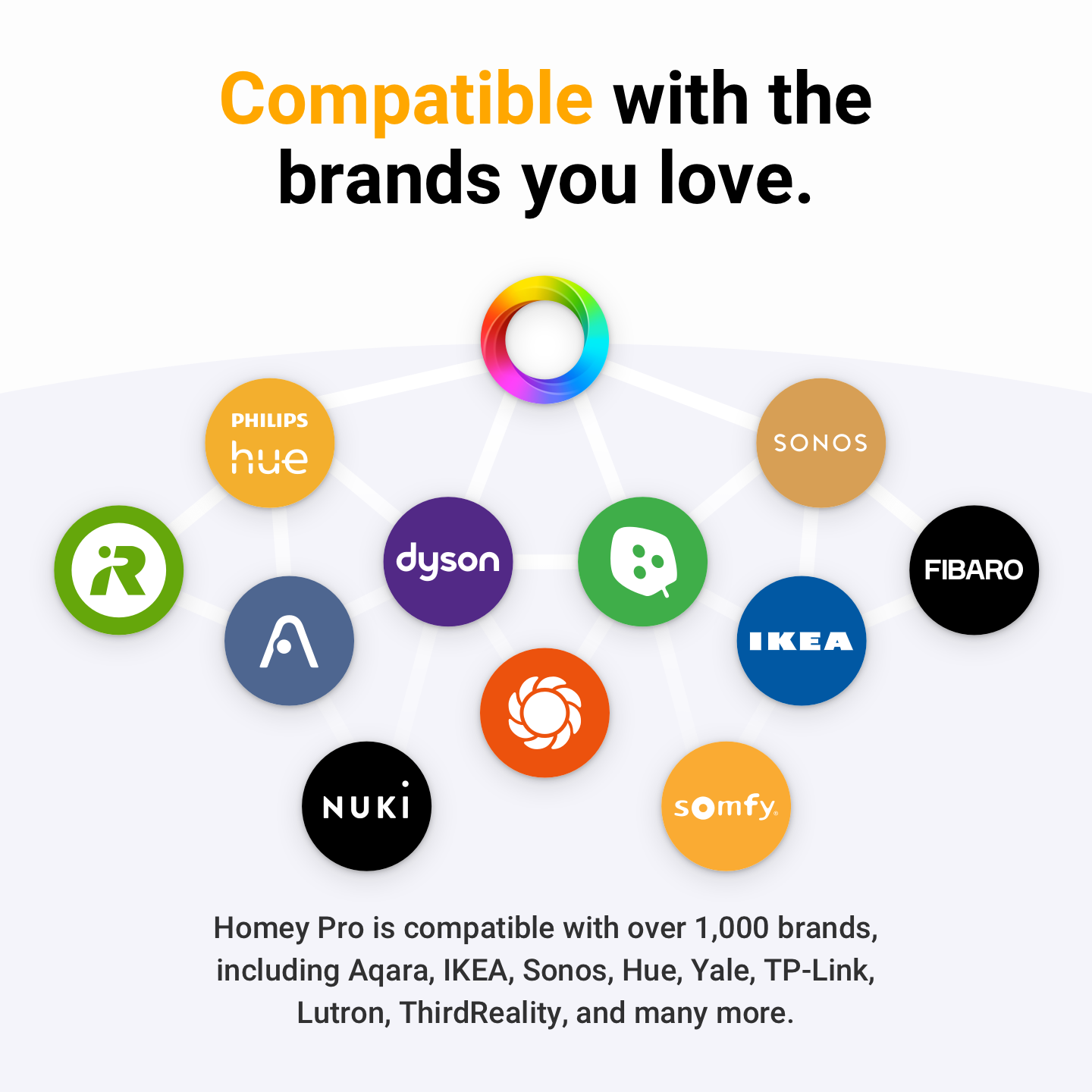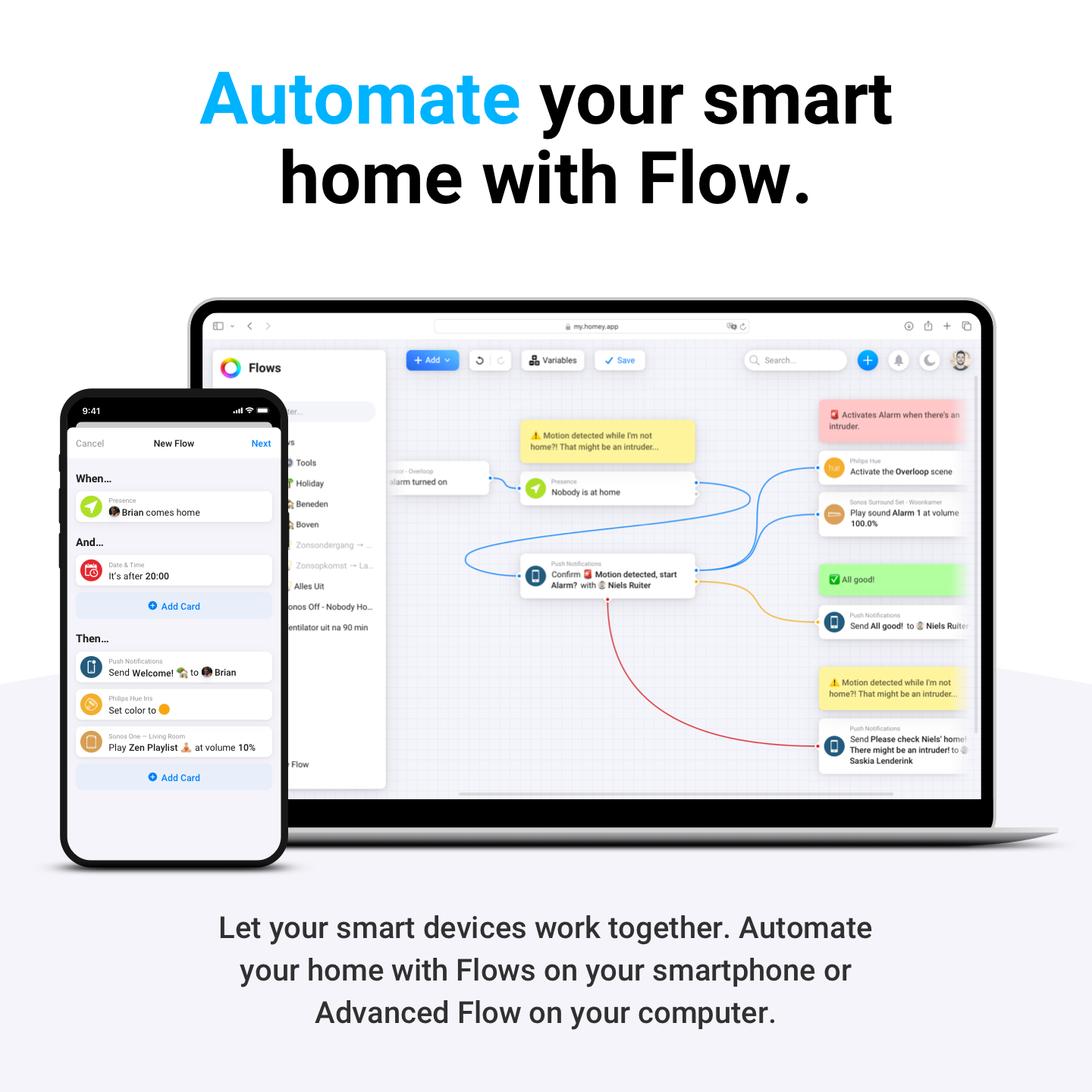 Homey Pro understøtter over 50.000 enheder fra mere end 1.000 forskellige mærker, hvilket giver dig frihed til at vælge de enheder, der passer bedst til dit hjem og dine præferencer. Gennem Homey-appen kan du nemt oprette avancerede automatiseringer, også kendt som "Flows", der lader dine enheder arbejde sammen på intelligente måder.