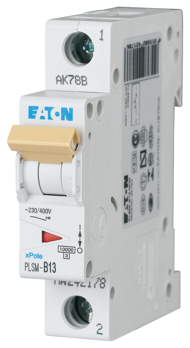 Automatsikring (MCB) PLSM, 1 polet, udløsningskarakteristik: C, nominel strøm In: 13 A, nominel koblingskapacitet i henhold til IEC/EN 60898-1: 10 kA, koblingsudstyr til beboelses- og erhvervsformål.