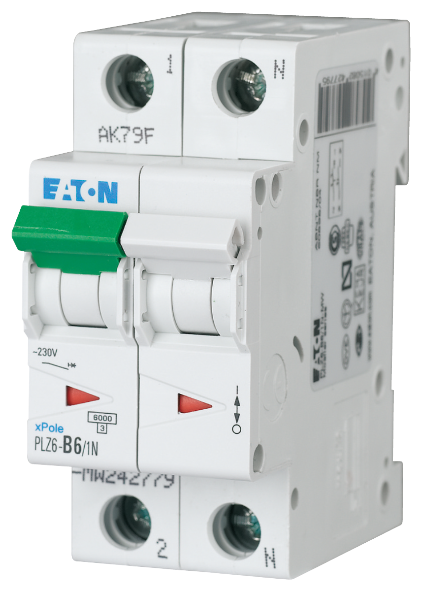 Automatsikring fra Eaton med 2 poler og en mærkestrøm på 6A. Har farvekodet betjeningsgreb og høj kortslutningsbrydeevne.