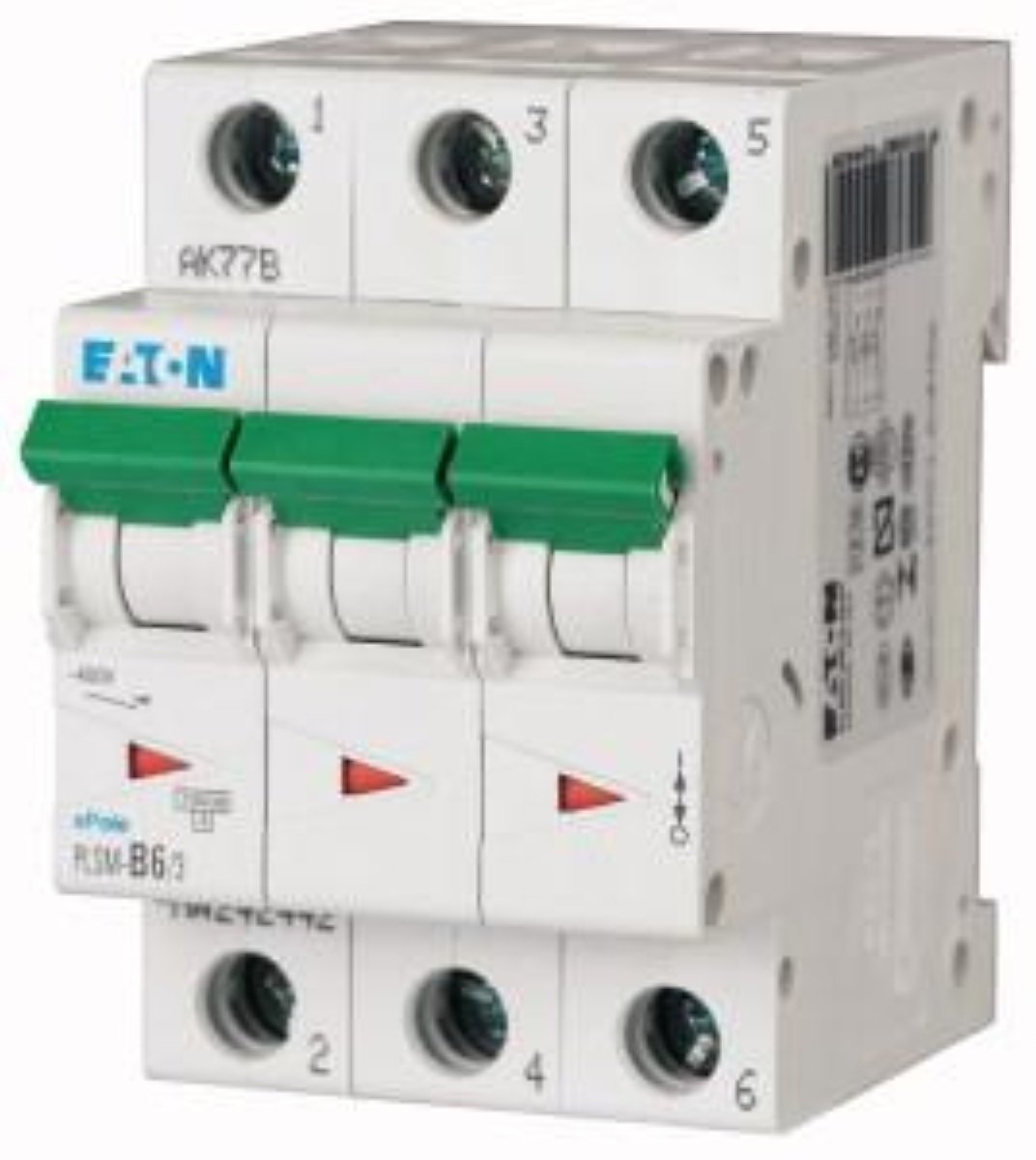 Automatsikring (MCB) PLSM, 3 polet, udløsningskarakteristik: C, nominel strøm In: 6 A, nominel koblingskapacitet i henhold til IEC/EN 60898-1: 10 kA, koblingsudstyr til beboelses- og erhvervsformål.