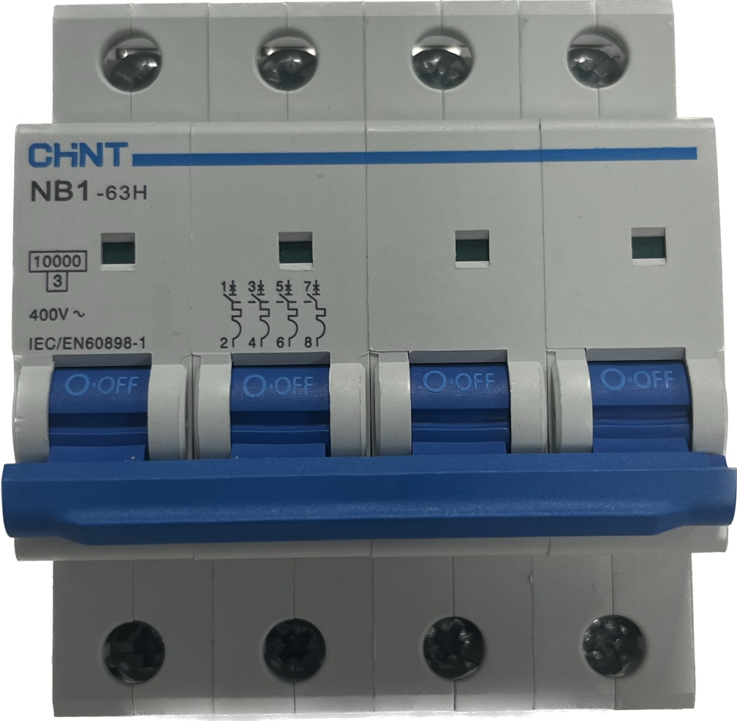Chint NB1-63H automatsikring med 4 poler, 63A og en brydeevne på 10kA. Ideel til beskyttelse af elektriske installationer.