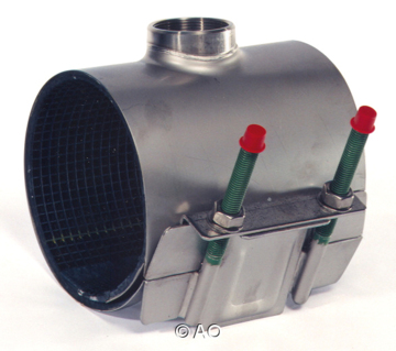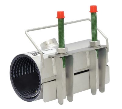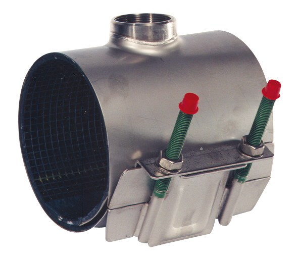 AVK bandagemuffe type FSA med BSP-afgang, fremstillet i rustfrit stål AISI 316. Den har en NBR-gummipakning og et tilspændingsmoment, der overføres som et radialt tryk for optimal tætning.