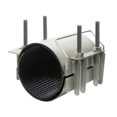 2-delt reparationsklamme i rustfrit stål AISI 316 med EPDM pakning. Til rør med udvendig diameter. Uden anboring. Til vand, gas og spildevand.
