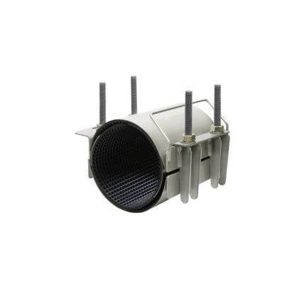2-delt reparationsklamme i rustfrit stål AISI 316 med EPDM pakning. Til rør med udvendig diameter, uden anboring. Velegnet til vand, gas og spildevand.