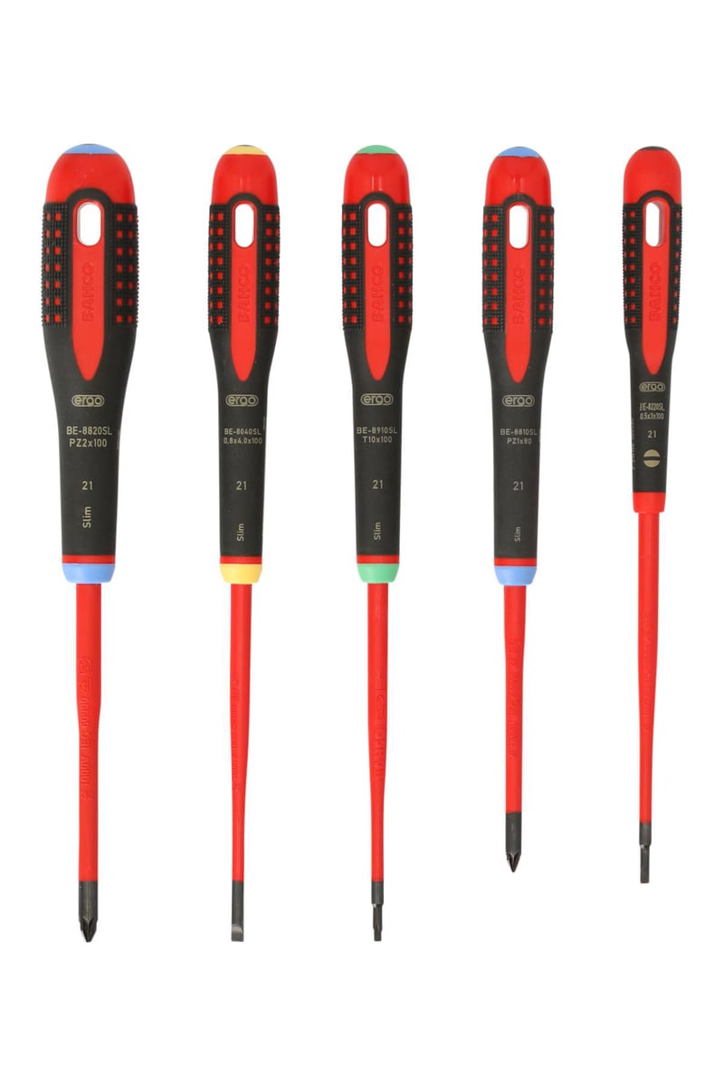 Bahco Slim-Blade skruetrækkersæt med 5 dele. Til ligekærv, Pozidriv og TORX® skruer. Med 30% smallere klinger for bedre adgang. Til arbejde under spænding op til 1000 V.
