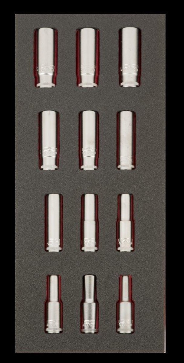 Bahco Fit&Go værktøjssortiment til 26" Bahco værkstedsvogne. Skumindlæg med rødt bundlag, der indikerer manglende værktøj. Indeholder 1/2" lange toppe: 10-21 mm.