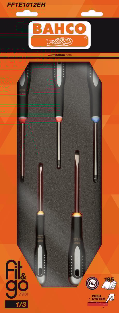 Bahco Fit&Go værktøjssortiment til 26" Bahco værkstedsvogne. Skumindlæg med rødt bundlag, der indikerer manglende værktøj. Indeholder 6 stk. ERGO skruetrækkere.