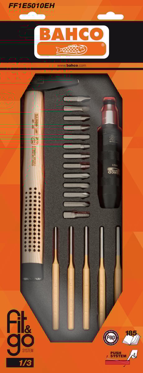 Dette Bahco Fit&Go værktøjssortiment er designet til at passe perfekt i alle 26" Bahco værkstedsvogne. Skumindlægget er udført i sort med et rødt bundlag, hvilket gør det nemt at identificere manglende værktøj.