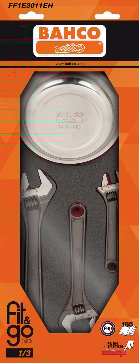 Bahco Fit&Go værktøjssortiment er designet til 26" Bahco værkstedsvogne. Skumindlægget sikrer, at værktøjet ligger sikkert og organiseret. Den smarte farvekombination med et sort øverste lag og et rødt bundlag giver et hurtigt overblik over manglende værktøj.