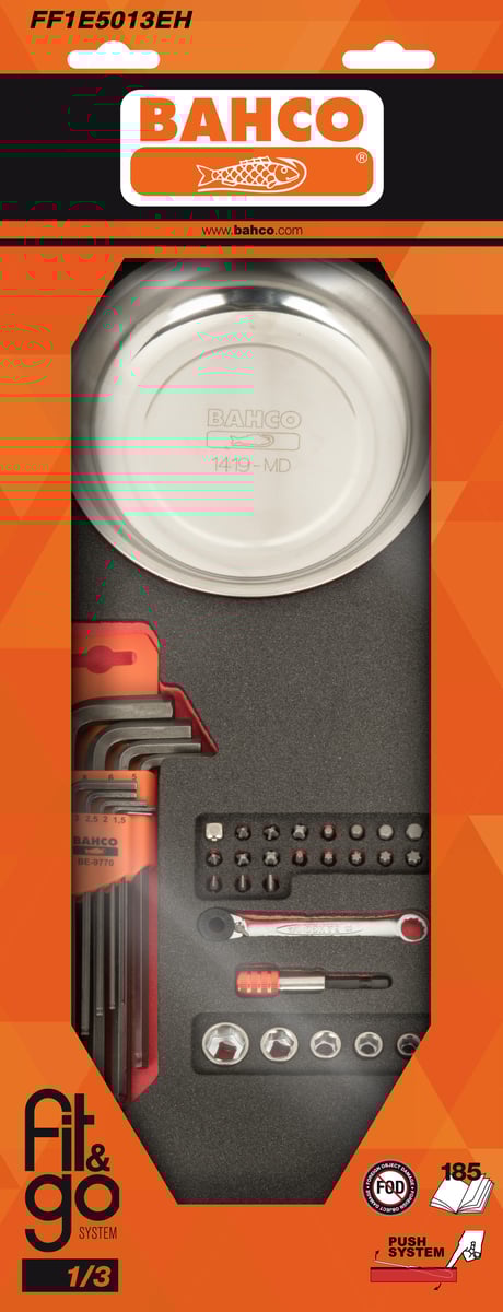 Dette Bahco Fit&Go værktøjssæt er ideelt til dig, der ønsker et organiseret og overskueligt arbejdsområde. Sættet består af 36 dele og leveres i et praktisk skumindlæg, der passer perfekt i alle 26" Bahco værkstedsvogne.