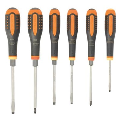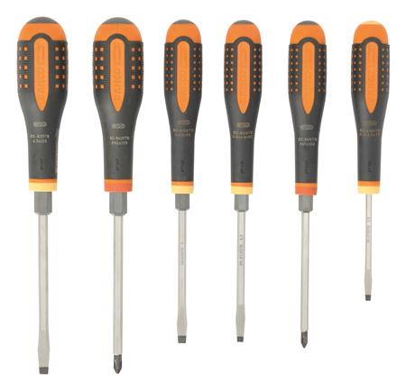 Slagskruetrækkersæt med 6 dele. Indeholder ligekærv- og phillips skruetrækkere. Skruetrækker udviklet i henhold til Bahcos ERGO™ program.