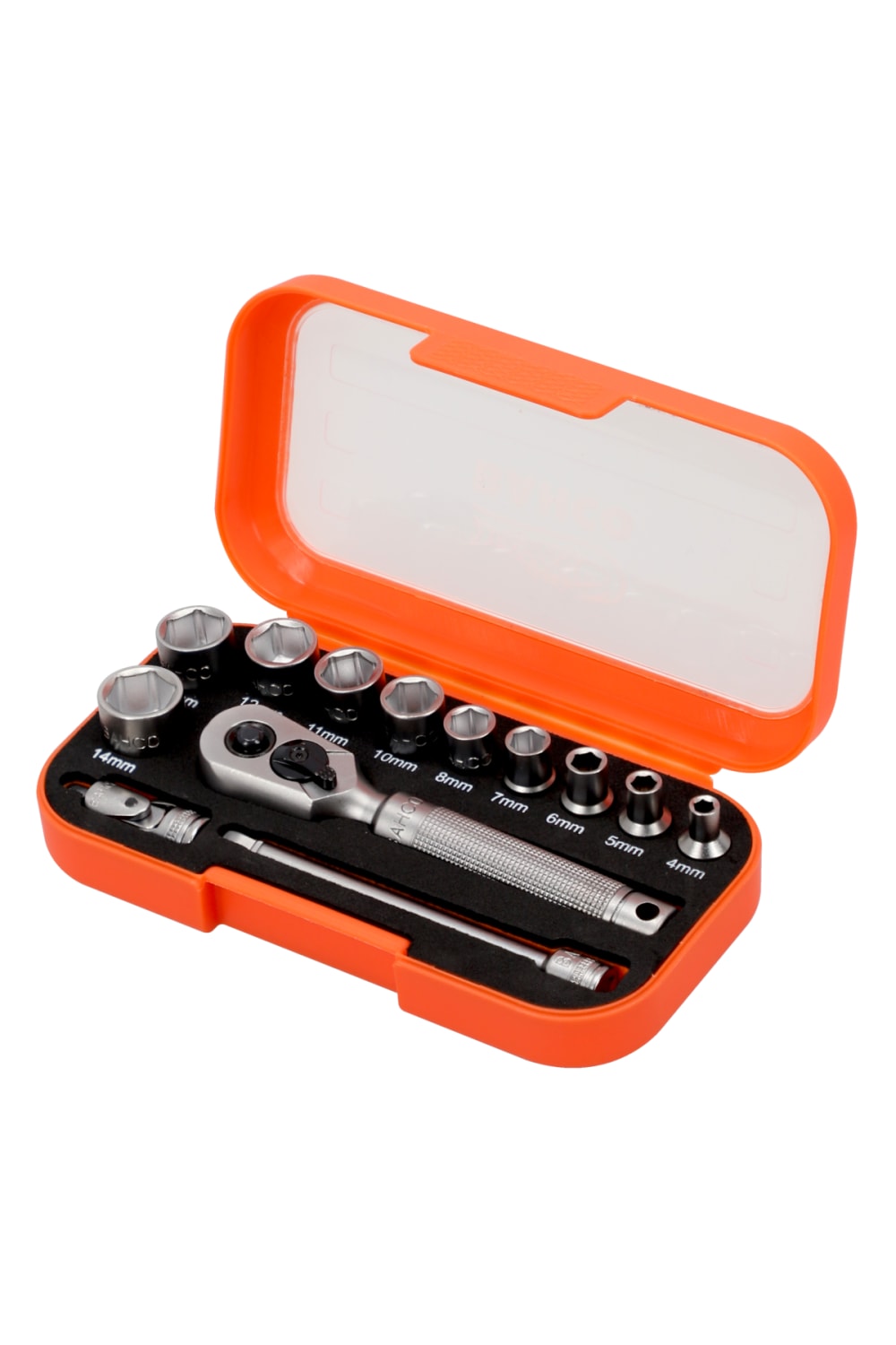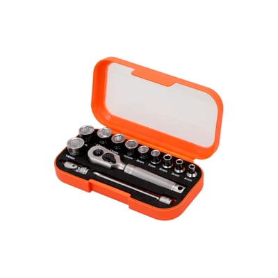 Bahco topnøglesæt med 13 dele til 1/4" fatning. Kompakt og alsidigt sæt til forskellige opgaver.