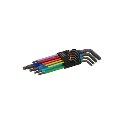 Bahco unbrakonøglesæt med 9 farvede nøgler, kuglehoved og metriske mål (1,5, 2, 2.5, 3, 4, 5, 6, 8, 10 mm). Easy fit-funktion sikrer fastholdelse og nem håndtering.