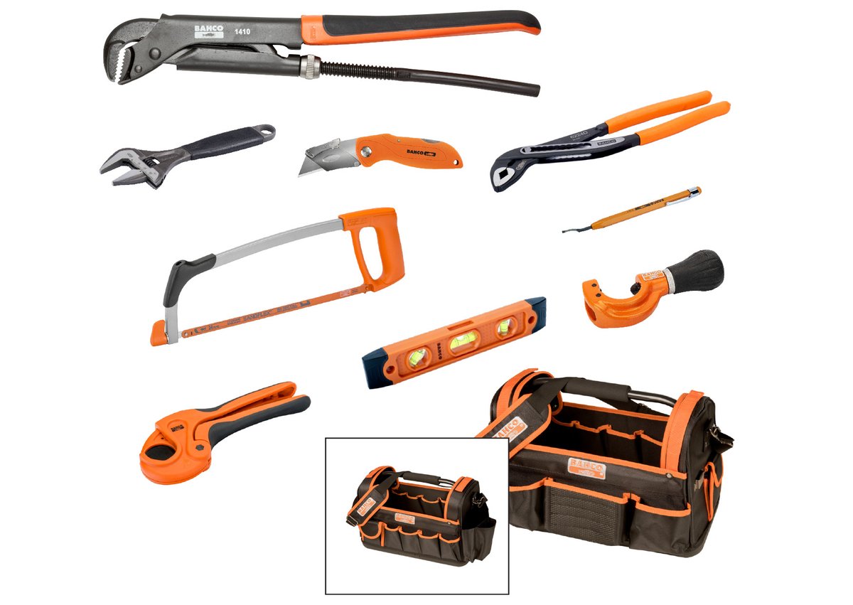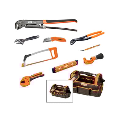 Bahco VVS-SET-1 værktøjssæt med 10 dele. Leveres i åben værktøjstaske med polstret bærestrop og håndtag. Tasken har lynlås, velcrostrop og 100% vandtæt bund.
