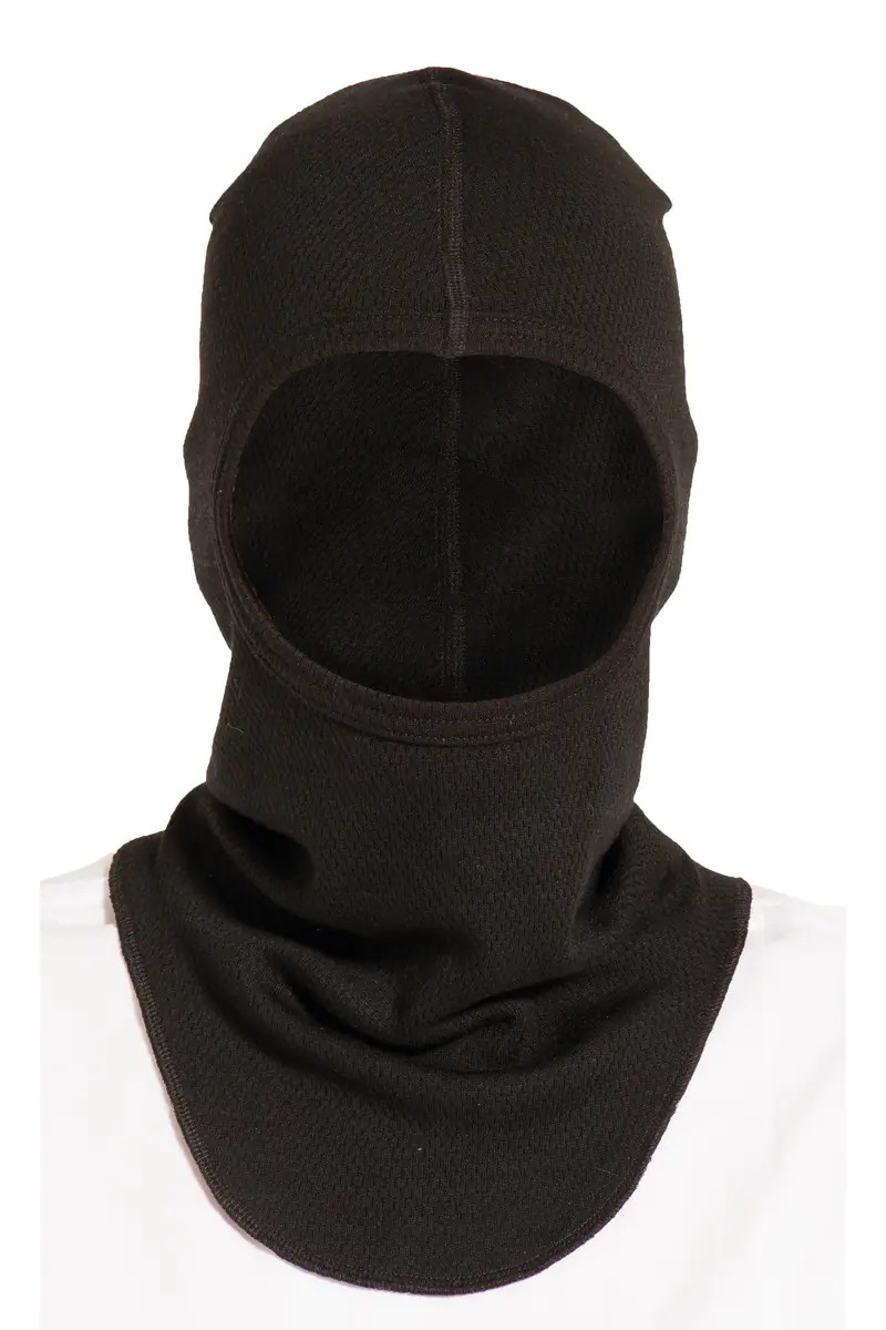 Flammehæmmende balaclava/elefanthue i blød jersey af merinould og FR-viskose. PFAS-fri. Beskytter hage, hals og kinder.