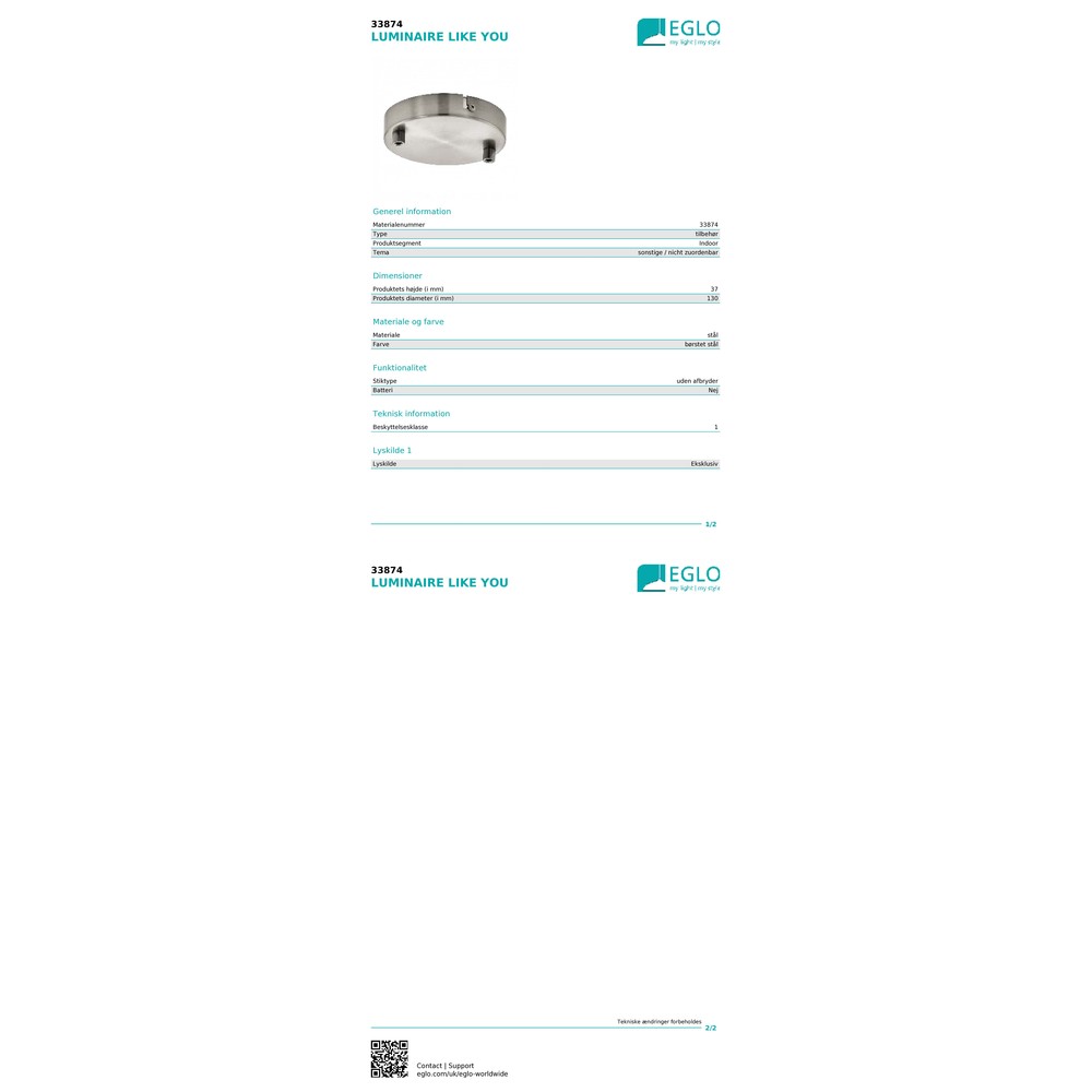 Eglo baldakin med 2 udtag i børstet stål. Denne baldakin har en diameter på 13 cm og en højde på 37 mm, velegnet til indendørs brug.