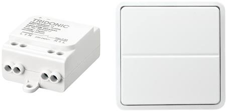 Trådløs DALI modtager med indbygget DALI strømforsyning (4mA). Kan udvides med DALI expander til 200mA. Inkluderer batterifrit trådløst tryk til Fuga systemet.