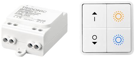 Trådløs DALI modtager med indbygget strømforsyning på 4mA. Kan udvides med DALI expander til 200mA. Inkluderer trådløst, batterifrit 4-tryk til lysstyring.
