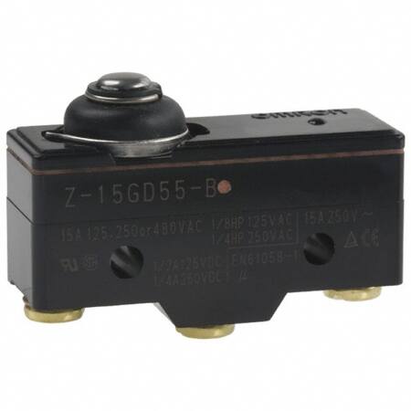 Robust basisafbryder med kort fjederstempel, SPDT-konfiguration og en kapacitet på 15 A. Leveres med skrueterminaler for nem installation.