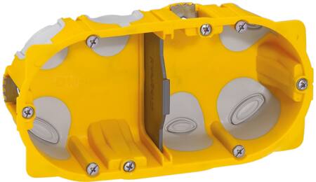 Denne gule forfradåse, også kendt som en 'Euro dåse', er designet til hurtig og nem installation i gips- og andre pladevægge. Den er kompatibel med blandt andet Legrand Mosaic og Niloé serien, hvilket gør den alsidig til forskellige installationsbehov.