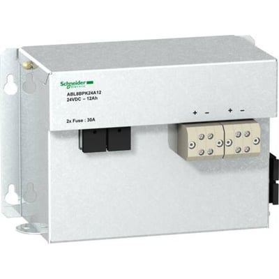 Schneider Electric ABL8 backup batteri med en lagringskapacitet på 12 ampere timer. Det leverer jævnspænding og har en nominel udgangsstrøm på 75A ved 24Vdc.