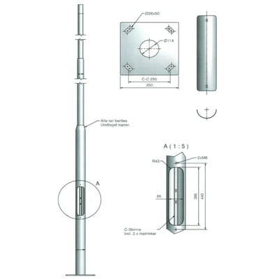 Bertlede mast, 9 meter, med fodflange og topmontage
