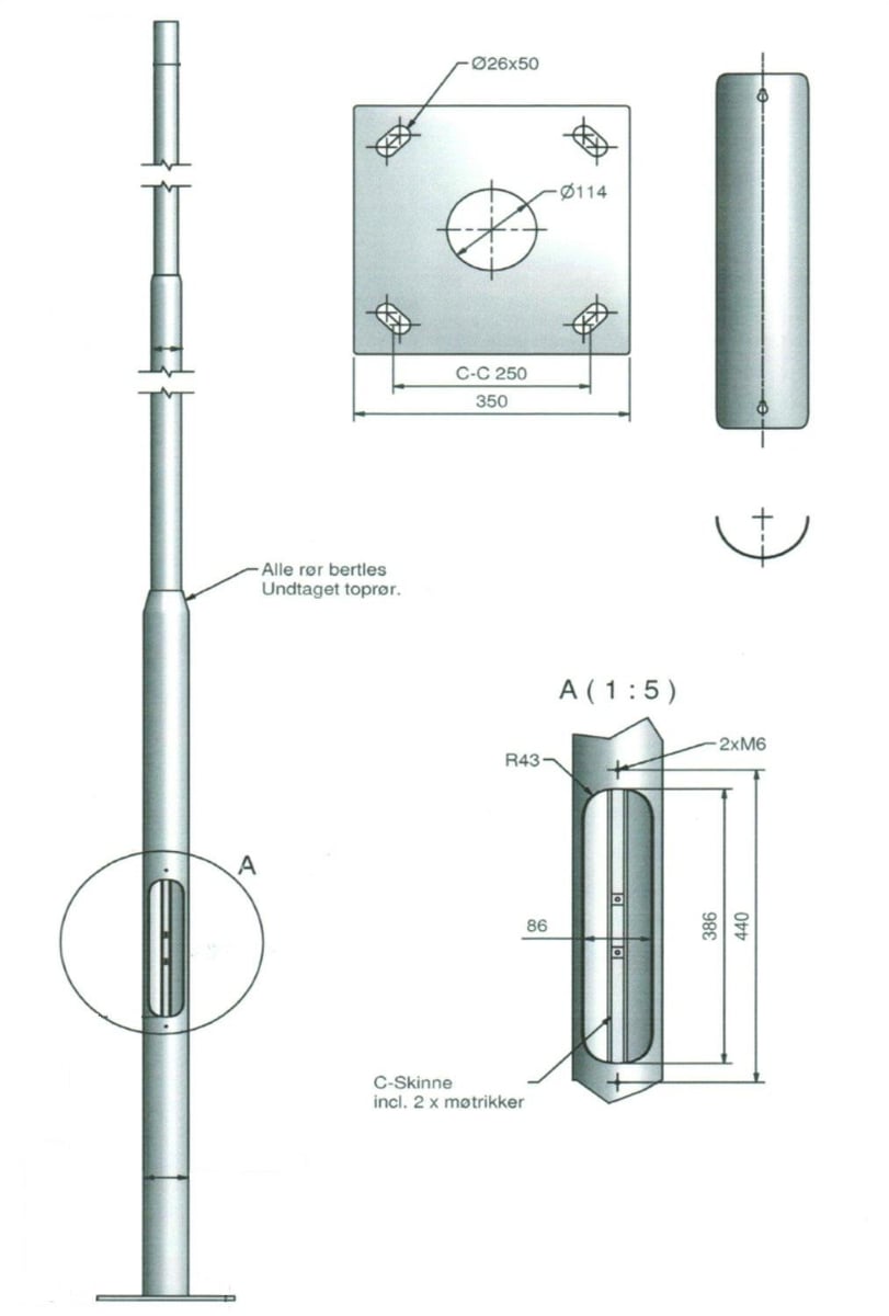 Bertlede mast, 9 meter med fodflange, topmontage Ø 60 mm. Varmforzinket i henhold til DS/EN ISO 1461. Kan leveres vådlakeret eller pulverlakeret i ønsket RAL-farve.