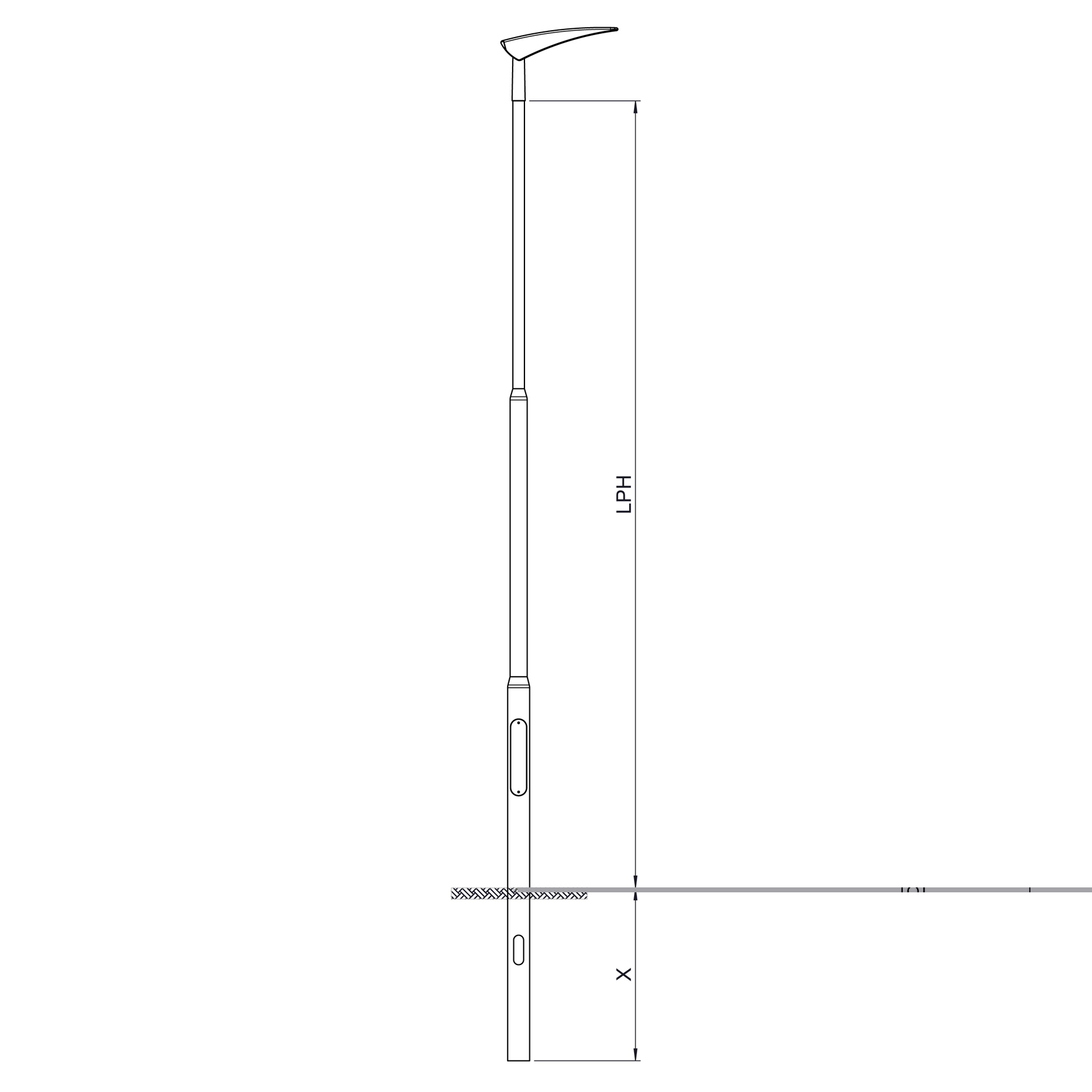 Bertlet belysningsmast til topmontage. CE-mærket og designet til terrænklasse II med en middelvind på 24 m/s. Nem adgang til sikringsindsats.