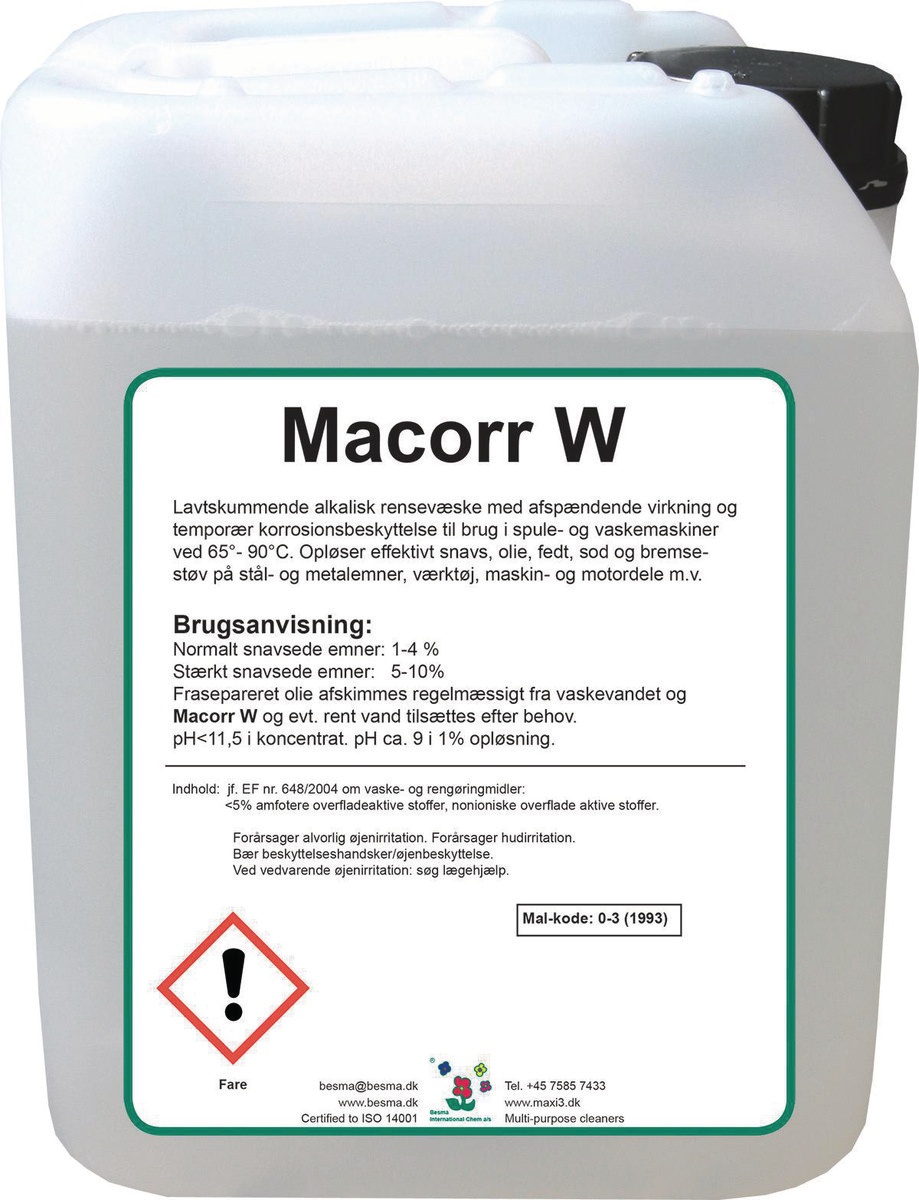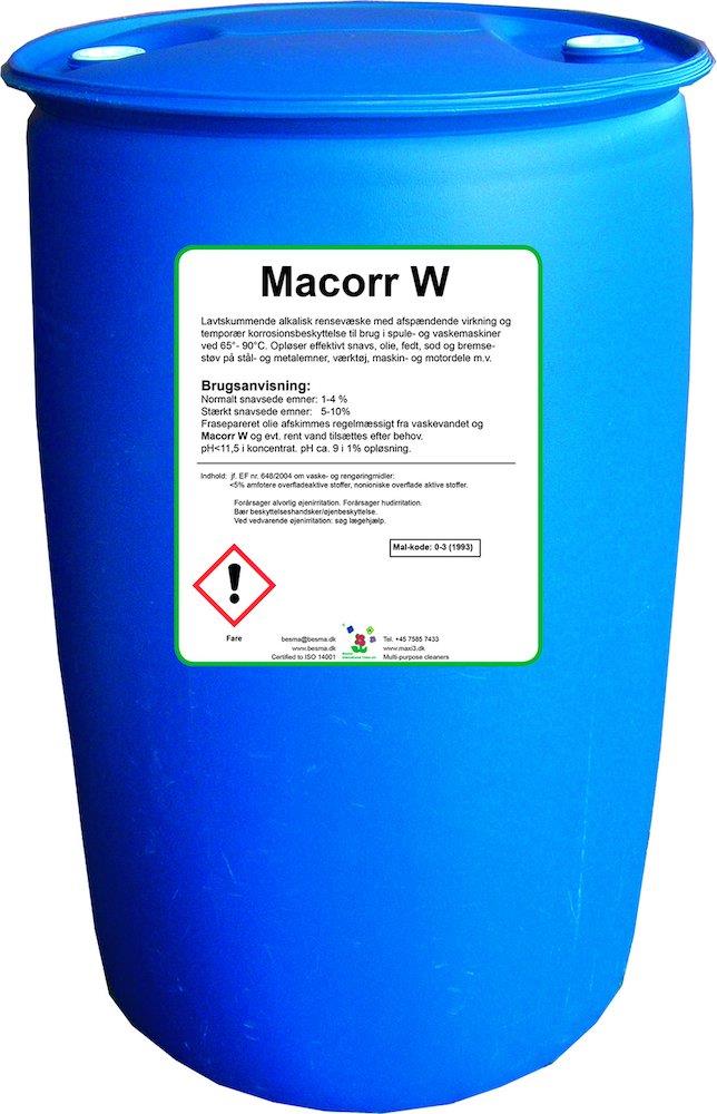 Macorr W er en lavtskummende alkalisk rensevask med forstærket korrosionsbeskyttelse. Den er ideel til afrensning og affedtning af værktøj, maskin- og motordele i spule- og vaskemaskiner.