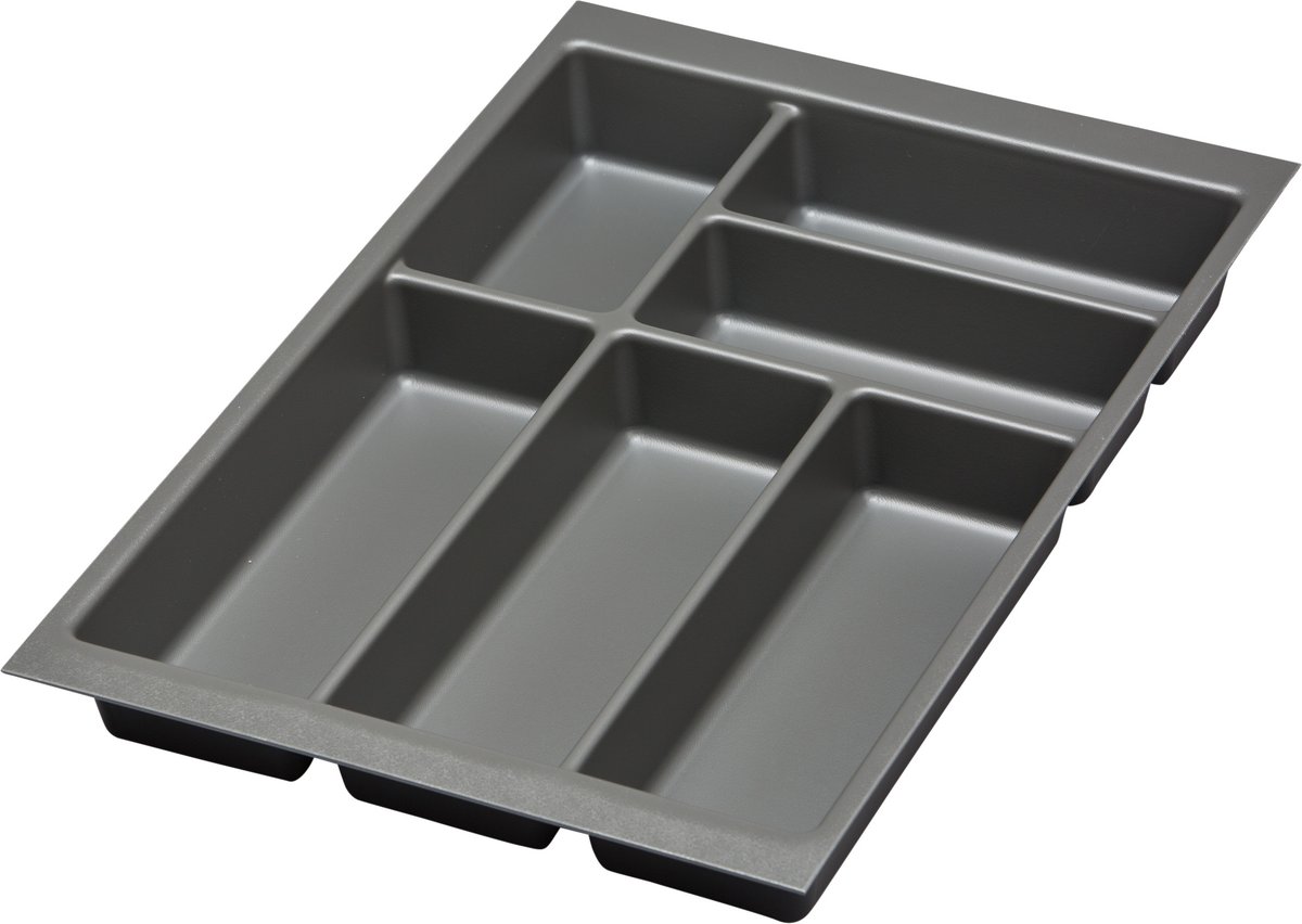 Bestikindsats med 6 rum i mørkegrå plast. Passer til 40 cm skuffebredde. Bredde: 319 mm. Dybde: 472 mm. Højde: 52 mm.