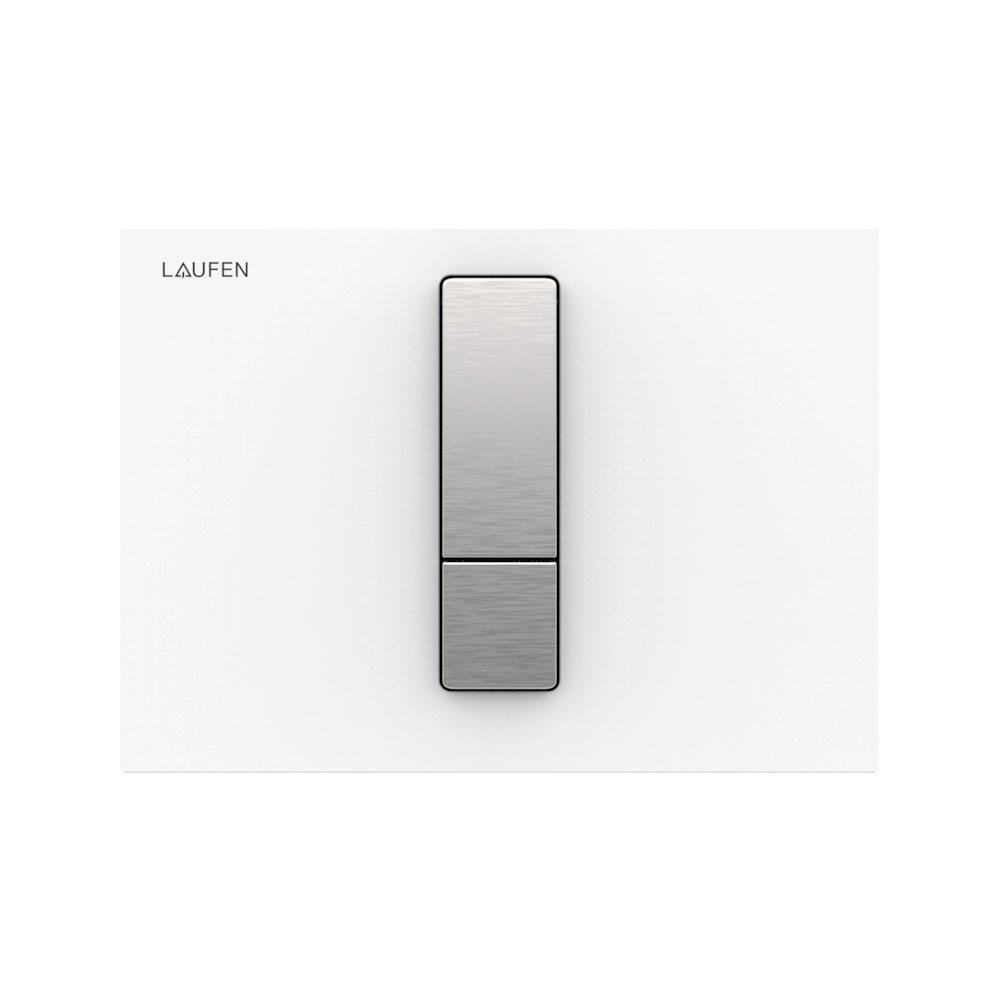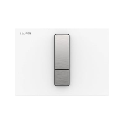 Laufen Lis AW102 betjeningsplade i hvidt glas med børstet stål look. Betjeningspladen har dobbeltskyl og monteres nemt via fleksibel kabeltilslutning.