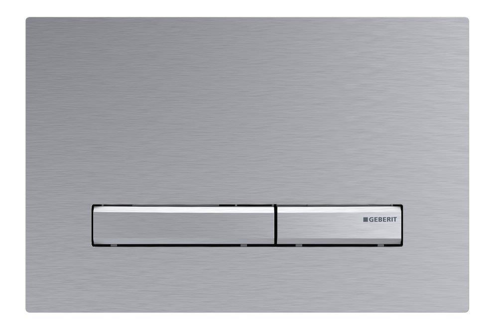 Geberit Sigma50 betjeningsplade til dobbeltskyl i metalfarve sort krom. Overfladen er børstet og har en easy-to-clean belægning, der gør rengøringen nemmere.