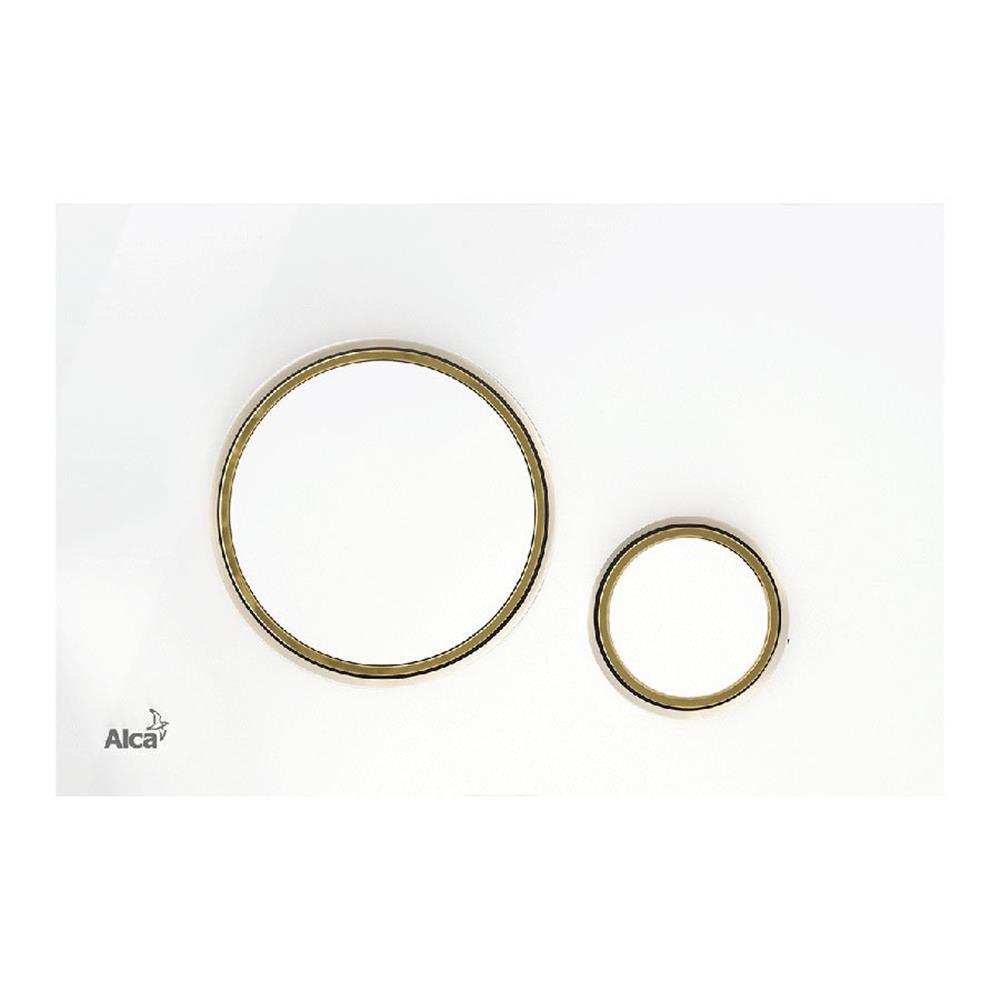 Denne ALCA M775 betjeningsplade er udført i et tyndt design og fremstillet i hvid/guld blank plast. Den har et elegant, rundt tryk og er designet til dobbeltskyl.