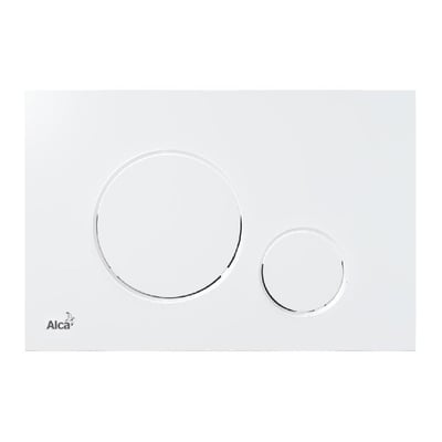 Denne ALCA M670 betjeningsplade er udført i hvid plast og har et stilrent, minimalistisk design. Den er udstyret med et rundt tryk og dobbeltskyl funktion, som giver mulighed for at spare på vandet.