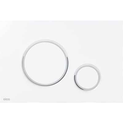 Denne ALCA M770 betjeningsplade er udført i hvid plast med krom ringe, hvilket giver et stilrent og moderne udtryk til dit badeværelse. Den er designet til frontbetjening og har dobbeltskyl funktion, så du kan spare på vandet.
