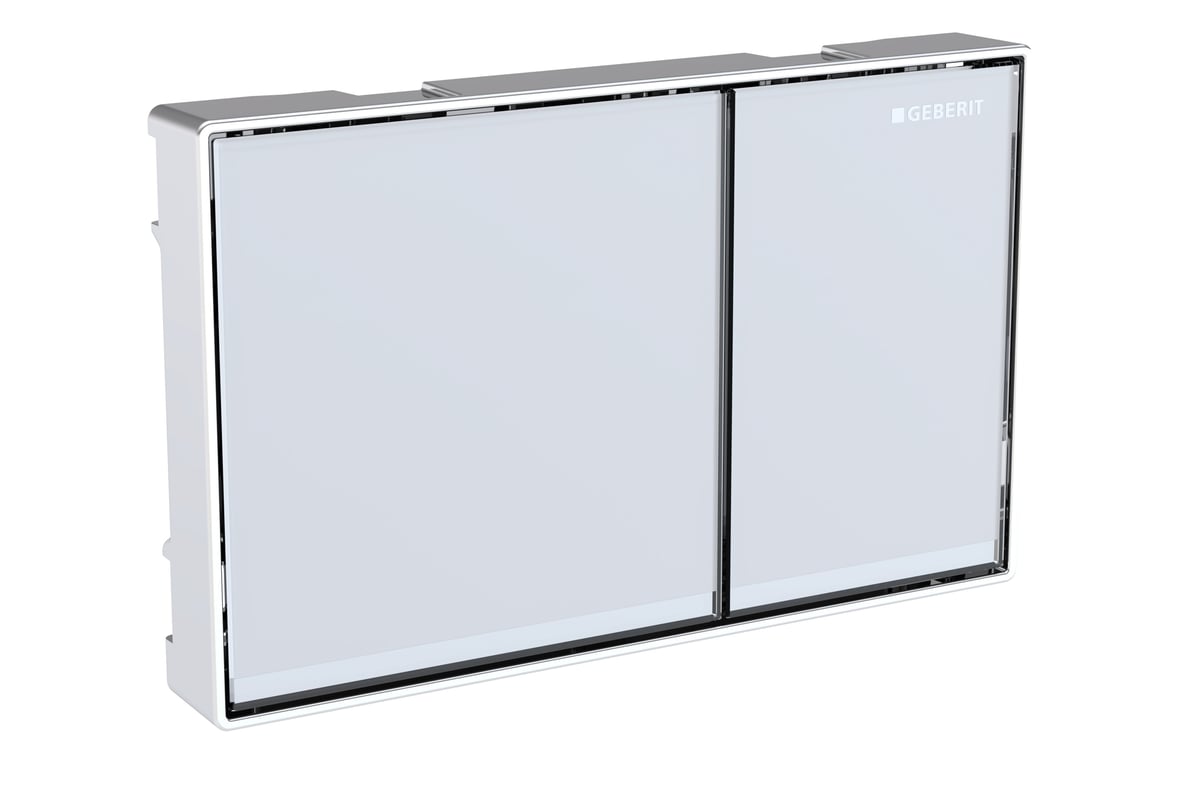 Geberit Omega60 betjeningsplade til dobbeltskyl. Knapper: hvid, designstriber: spejlglas, ramme: blankforkromet. Passer til Geberit Omega indbygningscisterner.