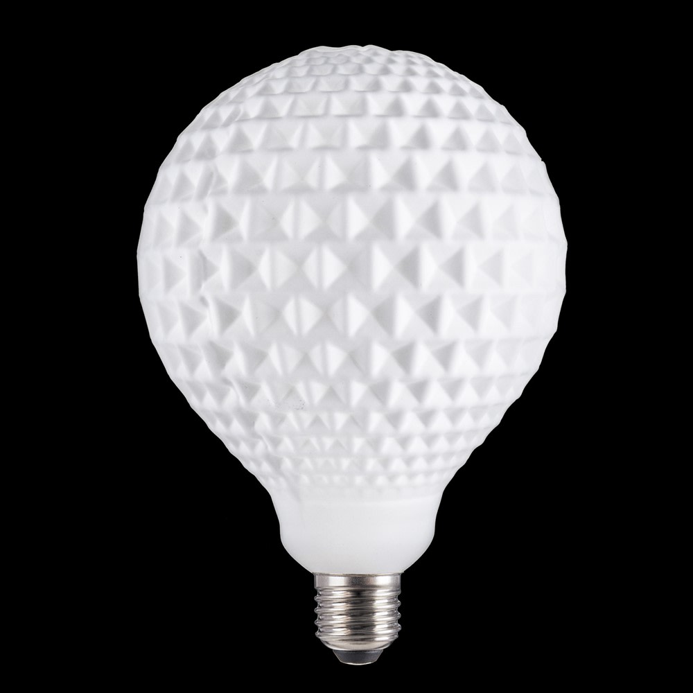 Denne Bianca globe pære kombinerer et stilfuldt design med moderne teknologi. Den matte, opale overflade med prikker giver et blødt og behageligt lys, der skaber en hyggelig atmosfære i ethvert rum.