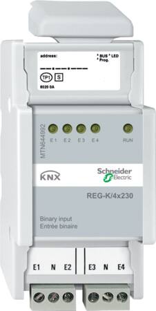 Denne KNX binære indgang er designet til at integrere almindelige 230V apparater, såsom bevægelses- og lyssensorer, direkte på KNX bussen. De indsamlede signaler kan derefter anvendes til at styre en række funktioner, herunder kobling, dæmpning, persiennebetjening og aktivering af scener.