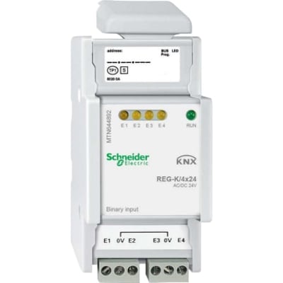 Denne KNX binære indgang er designet til at forbinde op til fire standard 24V apparater, såsom dør- og vindueskontakter, til et KNX-bussystem. Dette muliggør integration af simple kontakter i et intelligent bygningsautomationssystem.