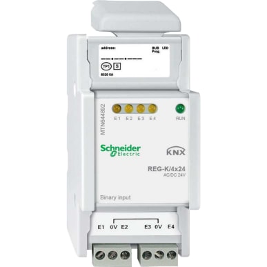 KNX binær indgang til DIN-skinne med 4 kanaler, der understøtter 24V AC/DC. Bruges til at forbinde standard 24V-enheder som dør- og vindueskontakter til KNX-bussen.