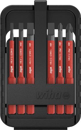 Wiha bitsæt med slimbit teknologi til arbejde på spændingsførende dele op til 1.000 V AC. Indeholder LK og PH bits i forskellige størrelser, der opbevares i smart bitboks.