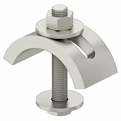 Bjælkeklo med sekskantmøtrik til direkte fastgørelse af konstruktioner på jernbjælker. Udført i syrefast rustfrit stål A4.